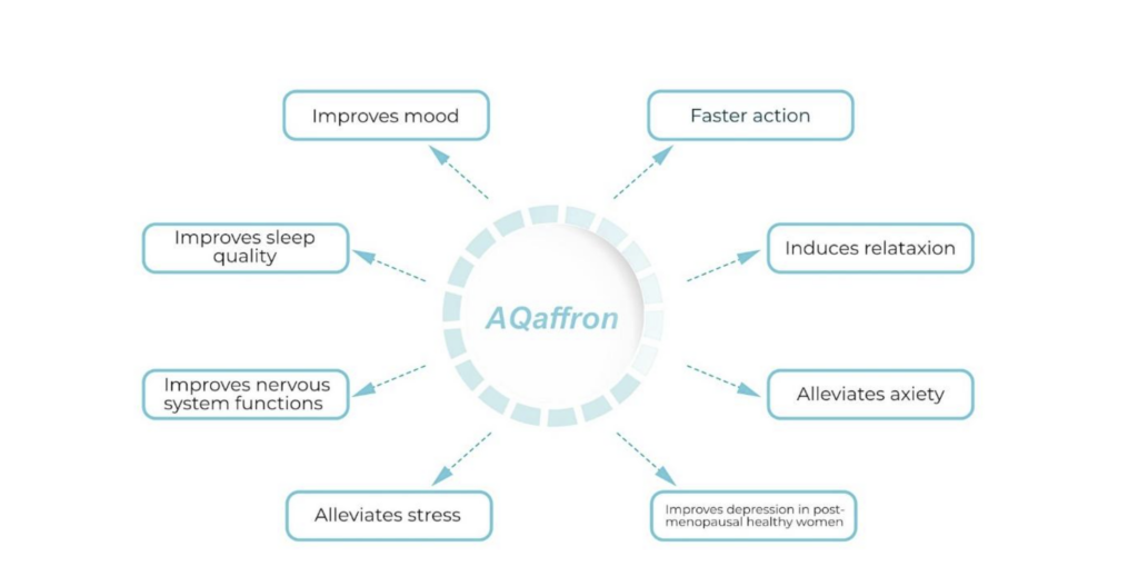 AQaffron enhances mood, reduces stress and anxiety, improves sleep quality, and supports nervous system function. It also promotes relaxation and helps alleviate depression symptoms in post-menopausal women.